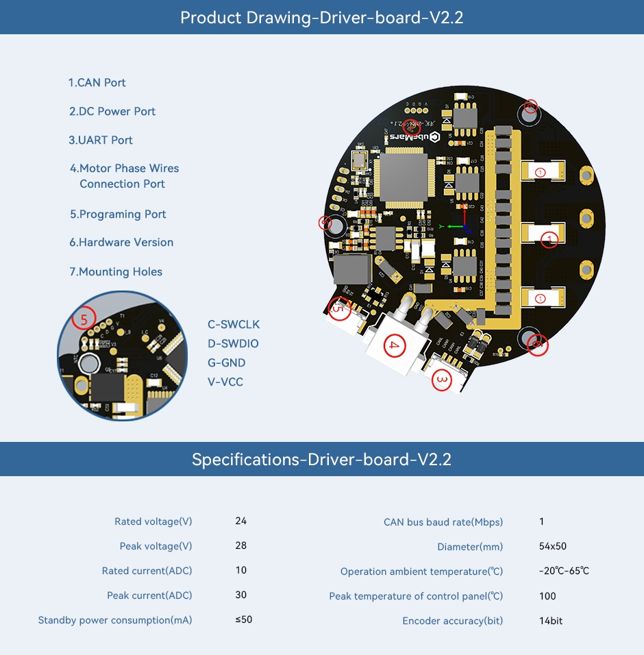 The CubeMars Driver Board-V2.2 is designed for use with the AK60-6 model integrated into the AK series. It operates at a rated voltage of 24V, has a peak current of 10A, an onboard 14-bit single-turn absolute encoder, built-in temperature sensor, and overload