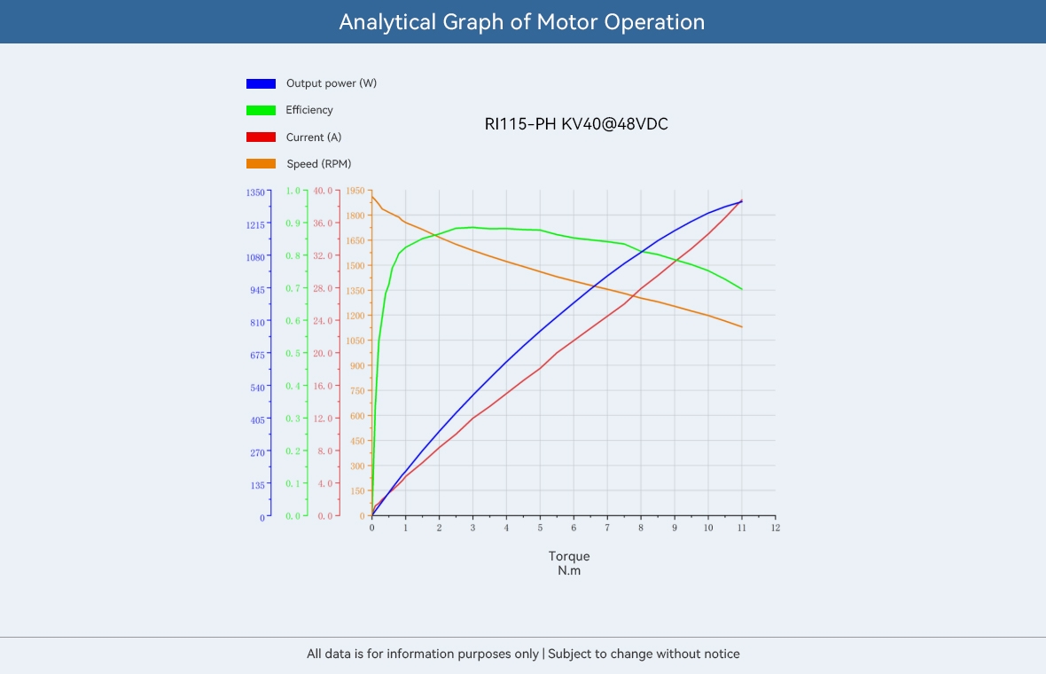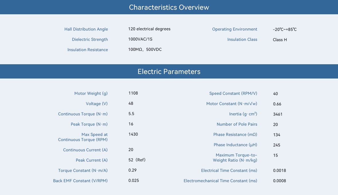 _x000D__x000D_|_x000D_ category |_x000D_ Model |_x000D_ Rated Voltage (V) |_x000D_ Rated Power (W) |_x000D_ Rated Torque (Nm) |_x000D_ Rated Current (A) |_x000D_ Rated Speed (RPM) |_x000D_ Peak Torque (Nm) |_x000D_ Peak Current (A) |_x000D_ No-load Speed (RPM) |_x000D_ Phase to Phase Resistance (mO) |_x000D_ Phase to Phase Inductance (µH) |_x000D_ Pole Pairs |_x000D_ Weight (G) |_x000D_ Size (diameter *length) MM |_x000D_ | --- | --- | --- | --- | --- | --- | --- | --- | --- | --- | --- | --- | --- | --- | --- | _x000D__x000D__x000D_|_x000D_ RI Potting Frameless Inrunner Torque Motor |_x000D_ RI75-PH |_x000D_ 48 |_x000D_ 297 |_x000D_ 1.2 |_x000D_ 7.28 |_x000D_ 2365 |_x000D_ 3.8 |_x000D_ 24.2 |_x000D_ 3360 |_x000D_ 495 |_x000D_ 673 |_x000D_ 14 |_x000D_ 348 |_x000D_ ?70*31.8 |_x000D_ _x000D_|_x000D_ RI Potting Frameless Inrunner Torque Motor |_x000D_ RI85-PH |_x000D_ 48 |_x000D_ 637 |_x000D_ 2 |_x000D_ 16 |_x000D_ 3042 |_x000D_ 5 |_x000D_ 44 |_x000D_ 4080 |_x000D_ 138.5 |_x000D_ 239.4 |_x000D_ 14 |_x000D_ 411 |_x000D_ ?85*27.3 |_x000D_ _x000D_|_x000D_ RI Potting Frameless Inrunner Torque Motor |_x000D_ RI115-PH |_x000D_ 48 |_x000D_ 823 |_x000D_ 5.5 |_x000D_ 20 |_x000D_ 1430 |_x000D_ 16 |_x000D_ 52 |_x000D_ 1920 |_x000D_ 134 |_x000D_ 245 |_x000D_ 20 |_x000D_ 1108 |_x000D_ ?115*38.1 |_x000D_ _x000D_|_x000D_ RI Framless Inrunner Motor |_x000D_ RI50 |_x000D_ 24/36/48 |_x000D_ 66 |_x000D_ 0.58 |_x000D_ 4.8 |_x000D_ 1090/1860/2600 |_x000D_ 1.67 |_x000D_ 14.8 |_x000D_ 2004/3006/4008 |_x000D_ 1420 |_x000D_ 1500 |_x000D_ 7 |_x000D_ 180.8 |_x000D_ ?54*27 |_x000D_ _x000D_|_x000D_ RI Framless Inrunner Motor |_x000D_ RI60 |_x000D_ 24/36/48 |_x000D_ 85 |_x000D_ 0.57 |_x000D_ 5.6 |_x000D_ 1440/2320/3190 |_x000D_ 1.63 |_x000D_ 16.8 |_x000D_ 2532/3798/5064 |_x000D_ 900 |_x000D_ 877.5 |_x000D_ 14 |_x000D_ 155.9 |_x000D_ ?60*23 |_x000D_ _x000D_|_x000D_ RI Framless Inrunner Motor |_x000D_ RI70 |_x000D_ 24/36/48 |_x000D_ 125 |_x000D_ 0.94 |_x000D_ 7.1 |_x000D_ 1270/1990/2710 |_x000D_ 2.68 |_x000D_ 21 |_x000D_ 1956/2934/3912 |_x000D_ 418 |_x000D_ 622.7 |_x000D_ 14 |_x000D_ 270.4 |_x000D_ ?76*24 |_x000D_ _x000D_|_x000D_ RI Framless Inrunner Motor |_x000D_ RI80 V2.0 |_x000D_ 24/36/48 |_x000D_ 172 |_x000D_ 1.45 |_x000D_ 9.4 |_x000D_ 1135/1785/2430 |_x000D_ 4.1 |_x000D_ 9.4 |_x000D_ 1480/2220/2960 |_x000D_ 330 |_x000D_ 510 |_x000D_ 8 |_x000D_ 411 |_x000D_ ?85*27 |_x000D_ _x000D_|_x000D_ RI Framless Inrunner Motor |_x000D_ RI100 |_x000D_ 24/36/48 |_x000D_ 252 |_x000D_ 1.76 |_x000D_ 13.6 |_x000D_ 1370/2100/2825 |_x000D_ 4.95 |_x000D_ 38.6 |_x000D_ 2184/3276/4368 |_x000D_ 126 |_x000D_ 366.7 |_x000D_ 14 |_x000D_ 500 |_x000D_ ?104*26 |_x000D_ _x000D__x000D_