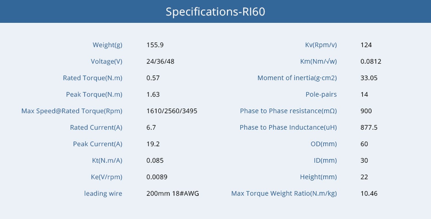 CubeMars RI60 120kv Brushless Innenläufer Motor 24V-48V 166g