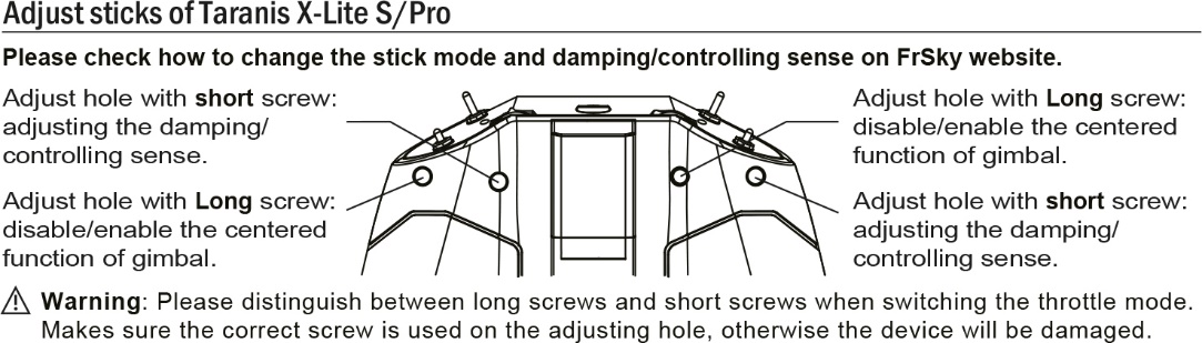 Mit den beiden **kurzen Schrauben (Short screw)** lässt sich der Widerstand der Steuerknüppel einstellen.