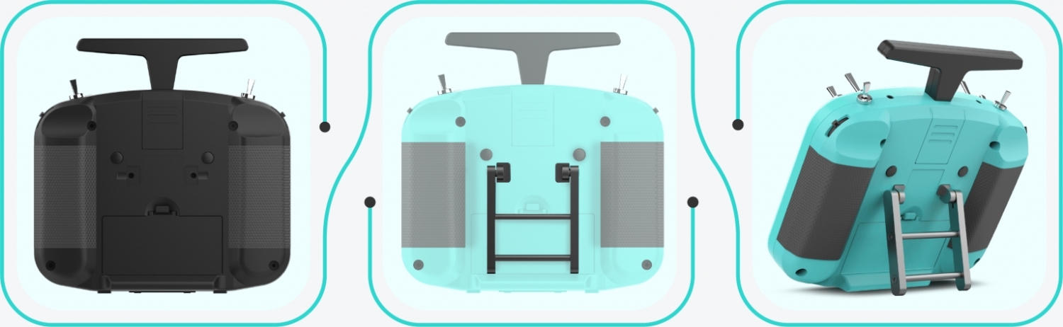 Zur weiteren Verbesserung seines benutzerfreundlichen Designs führt die TWIN X14S eine anbringbare und faltbare Halterung an der hinteren Schale ein. Dieses Design ermöglicht die einfache Installation eines zusätzlichen Ständerhalterzubehörs, wodurch die X14S nicht nur bequem getragen, sondern auch überall positioniert werden kann und so flexible Bedienung bietet, ohne den Sender in den Händen halten zu müssen.
