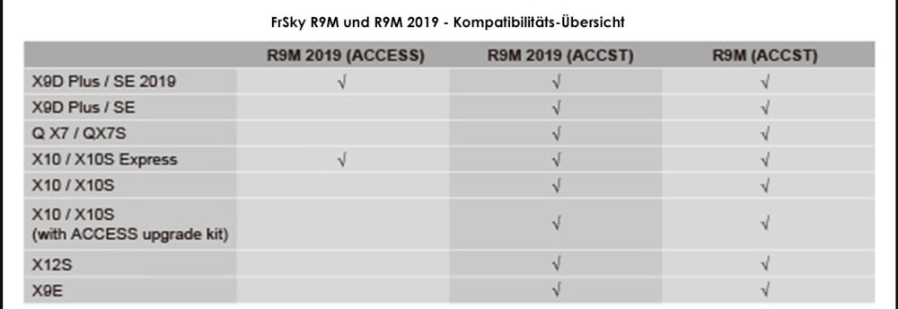 Kompatible Empfänger: Frsky R9, FrSky R9 Slim, R9 Slim+, R9 Mini (mit ACCESS Firmware)