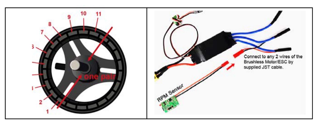 Über den JST Stecker müssen Sie zwei beliebige Kabel des Brushless Motors / Reglers mit dem Sensor verbinden. (Achtung! Bitte schließen Sie auf keinen Fall einen Akku an diesem Port an, das JST-System wird hier ausschließlich als Sensorkabel genutzt!).