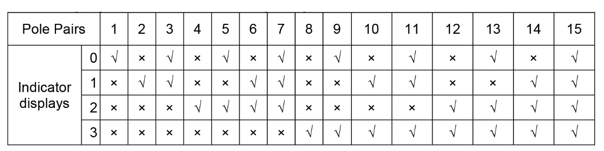 3\. In folgender Tabelle finden Sie die Übersicht welche Display-Anzeige der jeweiligen Polzahl entspricht. Drücken Sie die Key-Taste auf dem Sensor bis die rote LED dauerhaft leuchtet um die Anzahl der Polpaare einzustellen. Drücken Sie wiederholt die Key-Taste bis die gewünschte Kombination eingestellt ist.