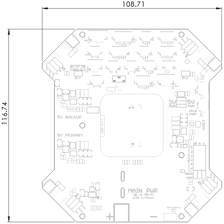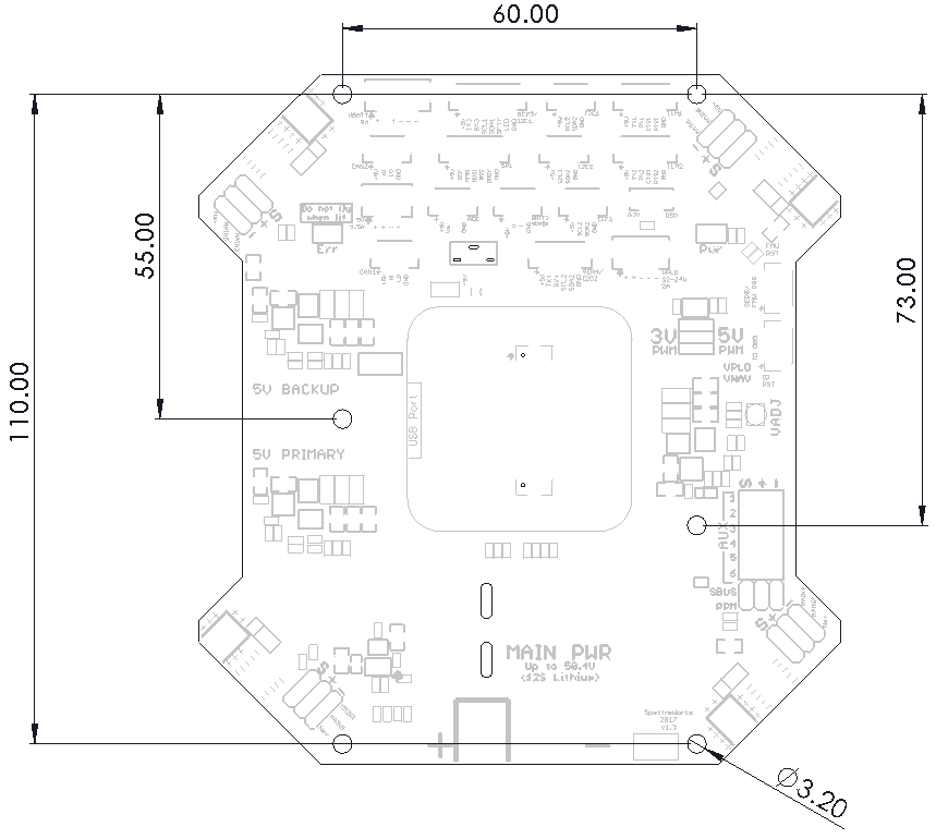 While this carrier board is geometrically optimized for quadcopters, X8 configurations, and octocopters, it provides connections for every function of The CUBE autopilot. Therefore, this board can be integrated into any vehicle type that is supported by The CUBE, including all other multi-rotor frame types, plane, rover, sub, and antenna tracker.