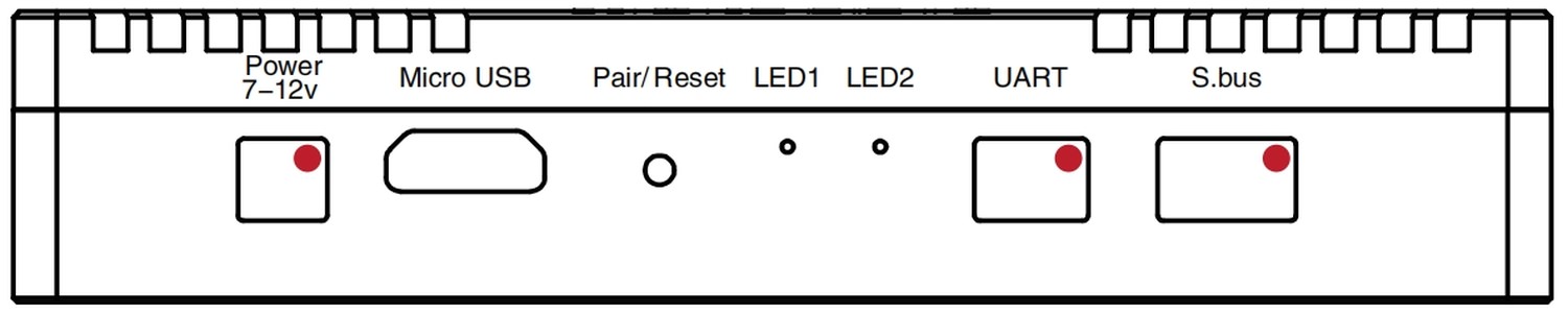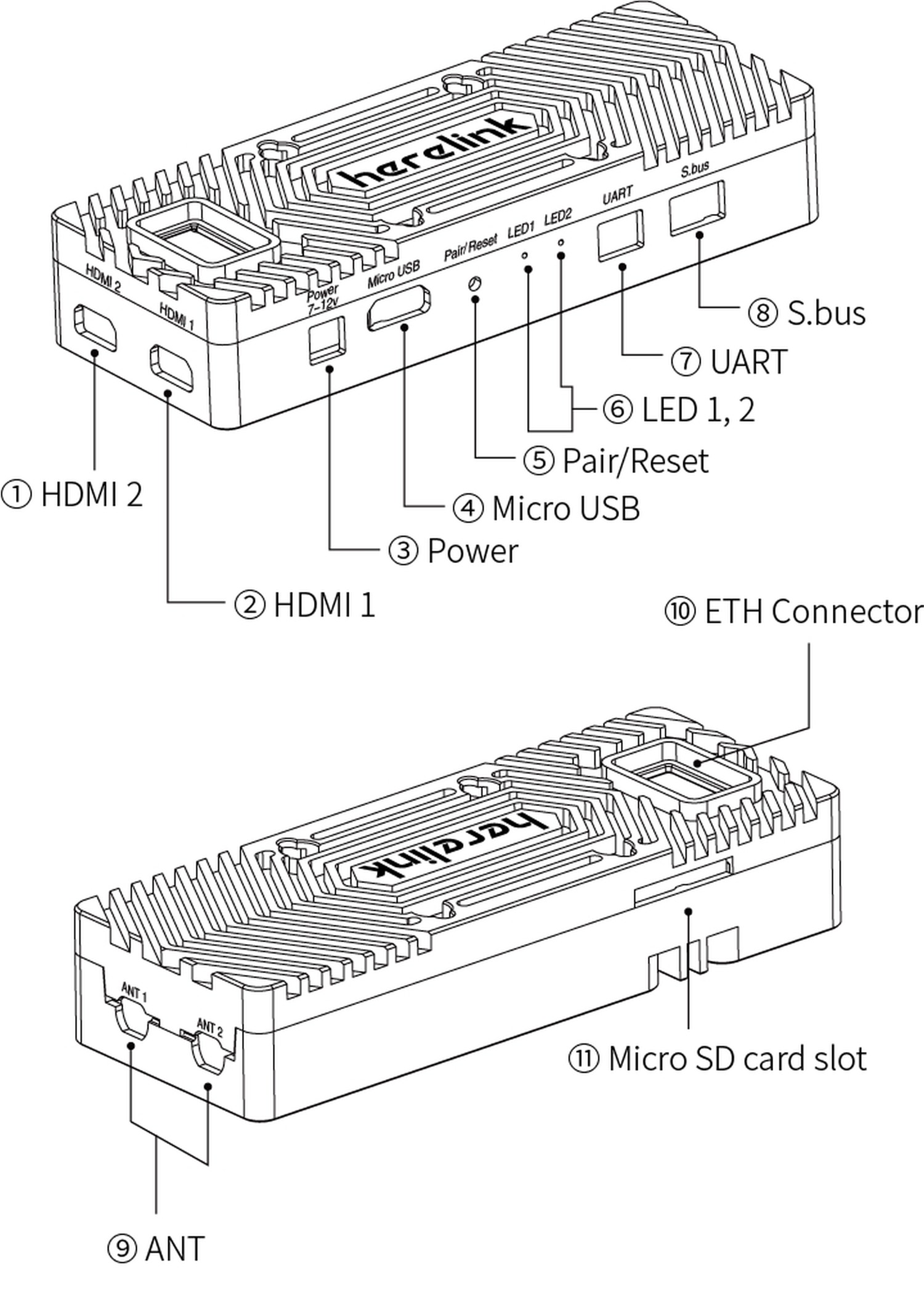 Case Material Aluminum Alloy Weight(antenna included) Herelink V2: 98g Size 78.5×30×15mm Signal Bandwidth 20MHz / 10MHz Power Consumption The average power consumption does not exceed 4W Micro HDMI 1 Camera video signal input (Recommend) Micro HDMI 2 Camera video signal input Power Input Recommended supply voltage ~7V: minimum 6V, maximum 12V and avoid sharing BEC with servos UART Interface 3.3V UART S.bus Interface Dual RCout ,S.bus1 and S.bus2 Micro USB Used for debugging and upgrading, support OTG mode**(no need external power for USB device)** Buttom Used for pairing and state reset Indicator light 1 ,2 Used to indicate state for pairing and vedio transmission MMCX antenna jack 1,2 Used for signal transmission and ground communication SD Slot(only supported by Airunit 1.1) For future usage ETH Interface(only supported by Airunit 1.1) Network protocol device access