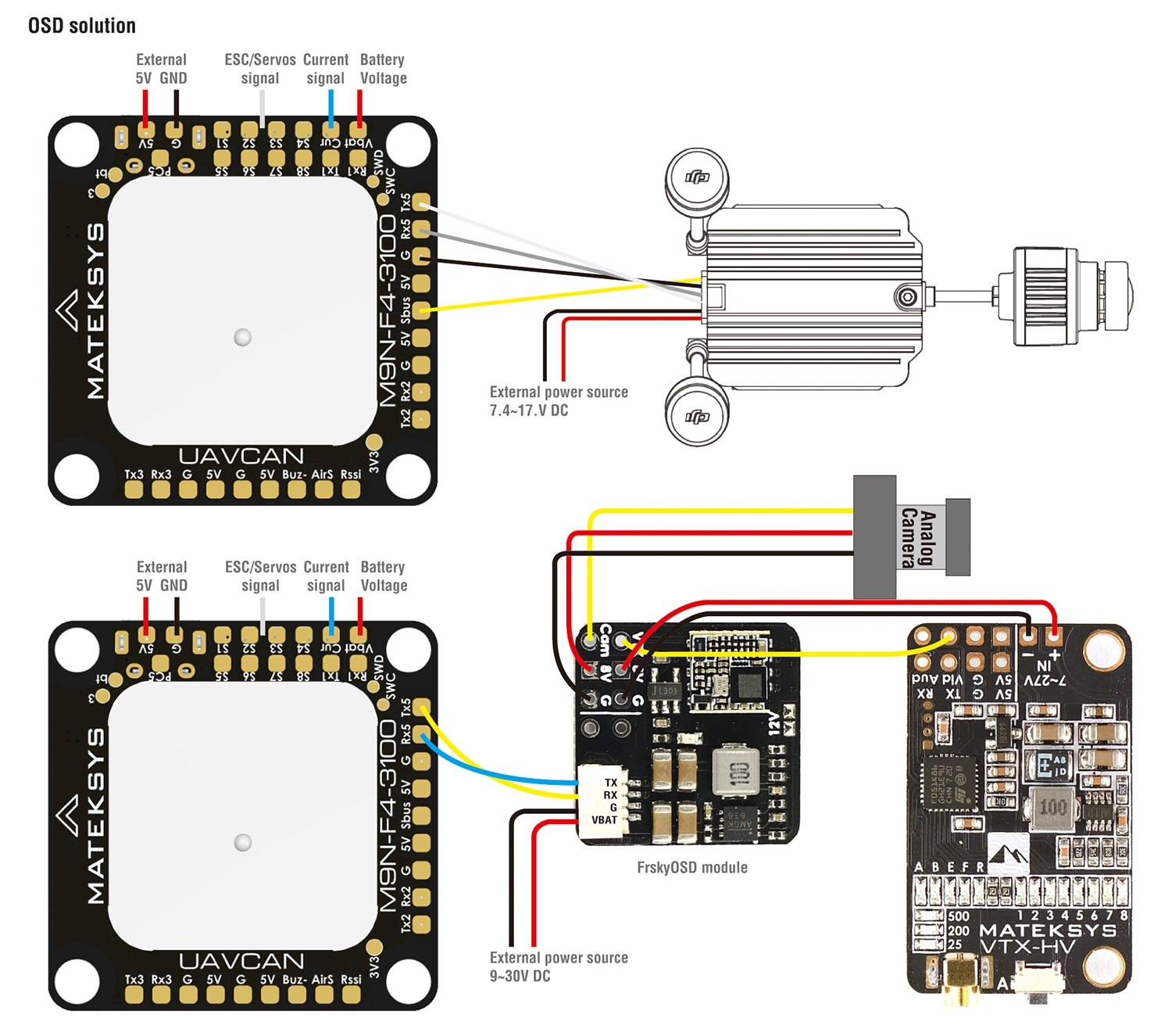 M9N-F4 series don’t have MAX7456/AT6456 OSD chip integrated. If you use M9N-F4-xxxx as a flight controller. you might use DJI FPV OSD or FrskyOSD module.