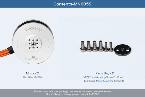 Lieferumfang des T-Motor MN605-S 170kv Angebots:- 2x T-Motor MN605-S mit 170kv- Zubehör für Propellermontage