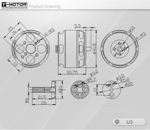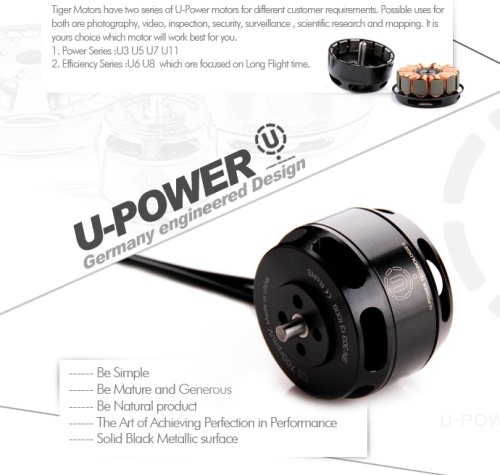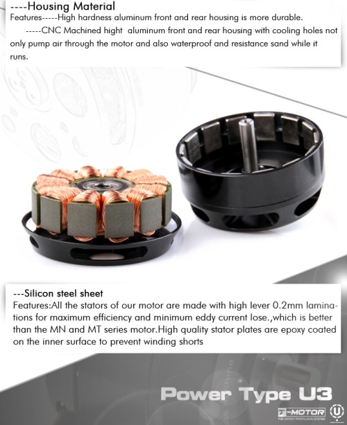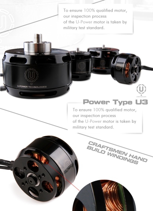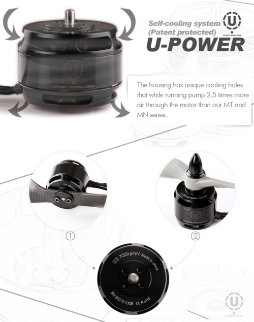 Der Motor wurde von Grund auf für Multicopter-Anwendungen entwickelt, was einem hohen Wirkungsgrad und einer langen Lebensdauer zu Gute kommt.Die Motoren der U-Power Serie sind die neueste Entwicklung von T-Motor und verfügen über die Möglichkeit Carbon-Propeller direkt auf dem Motorgehäuse zu montieren.