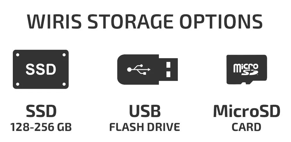 Da die WIRIS Pro im Laufe einer einzigen Inspektion eine riesige Menge radiometrischer Daten aufzeichnet hat sich Workswell dazu entschlossen, dass die WIRIS Pro die einzige explizit für Drohneneinsätze vorgesehene Kamera mit eigener SSD sein soll um die optimale Performance zu erreichen. Die WIRIS Pro verfügt gibt es mit zwei vershiedenen Speicherkapazitäten. Entweder als 128GB SSD und 256 GB SSD. Die Daten können auch auf einen externen USB Stick oder auf eine Micro-SD-Karte heruntergeladen werden.